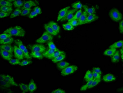 Immunofluorescence staining of HepG2 cells with CSB-PA019559LA01HU at 1:133, counter-stained with DAPI. The cells were fixed in 4% formaldehyde, permeabilized using 0.2% Triton X-100 and blocked in 10% normal Goat Serum. The cells were then incubated with the antibody overnight at 4°C. The secondary antibody was Alexa Fluor 488-congugated AffiniPure Goat Anti-Rabbit IgG(H+L).