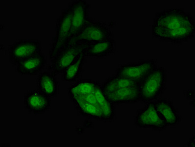 Immunofluorescent analysis of HepG2 cells using CSB-PA019591LA01HU at dilution of 1:100 and Alexa Fluor 488-congugated AffiniPure Goat Anti-Rabbit IgG(H+L)