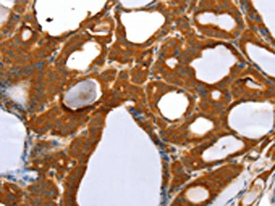 The image on the left is immunohistochemistry of paraffin-embedded Human thyroid cancer tissue using CSB-PA694536(RGS5 Antibody) at dilution 1/40, on the right is treated with fusion protein. (Original magnification: ×200)