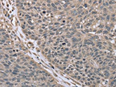 The image on the left is immunohistochemistry of paraffin-embedded Human lung cancer tissue using CSB-PA124825(RHEB Antibody) at dilution 1/40, on the right is treated with synthetic peptide. (Original magnification: ×200)