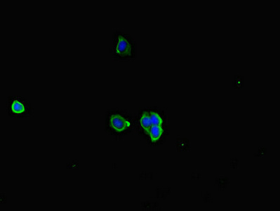 • Immunofluorescent analysis of HepG2 cells using CSB-PA671121LA01HU at dilution of 1:100 and Alexa Fluor 488-congugated AffiniPure Goat Anti-Rabbit IgG(H+L)