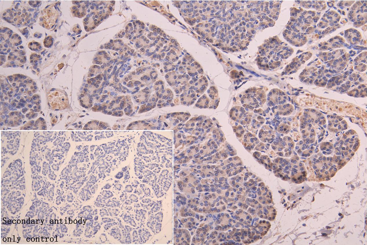 IHC image of CSB-PA019828LA01HU diluted at 1:300 and staining in paraffin-embedded human pancreatic tissue performed on a Leica BondTM system. After dewaxing and hydration, antigen retrieval was mediated by high pressure in a citrate buffer (pH 6.0). Section was blocked with 10% normal goat serum 30min at RT. Then primary antibody (1% BSA) was incubated at 4°C overnight. The primary is detected by a Goat anti-rabbit polymer IgG labeled by HRP and visualized using 0.05% DAB.