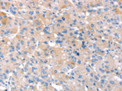 The image on the left is immunohistochemistry of paraffin-embedded Human liver cancer tissue using CSB-PA215699(RNF214 Antibody) at dilution 1/20, on the right is treated with fusion protein. (Original magnification: ×200)