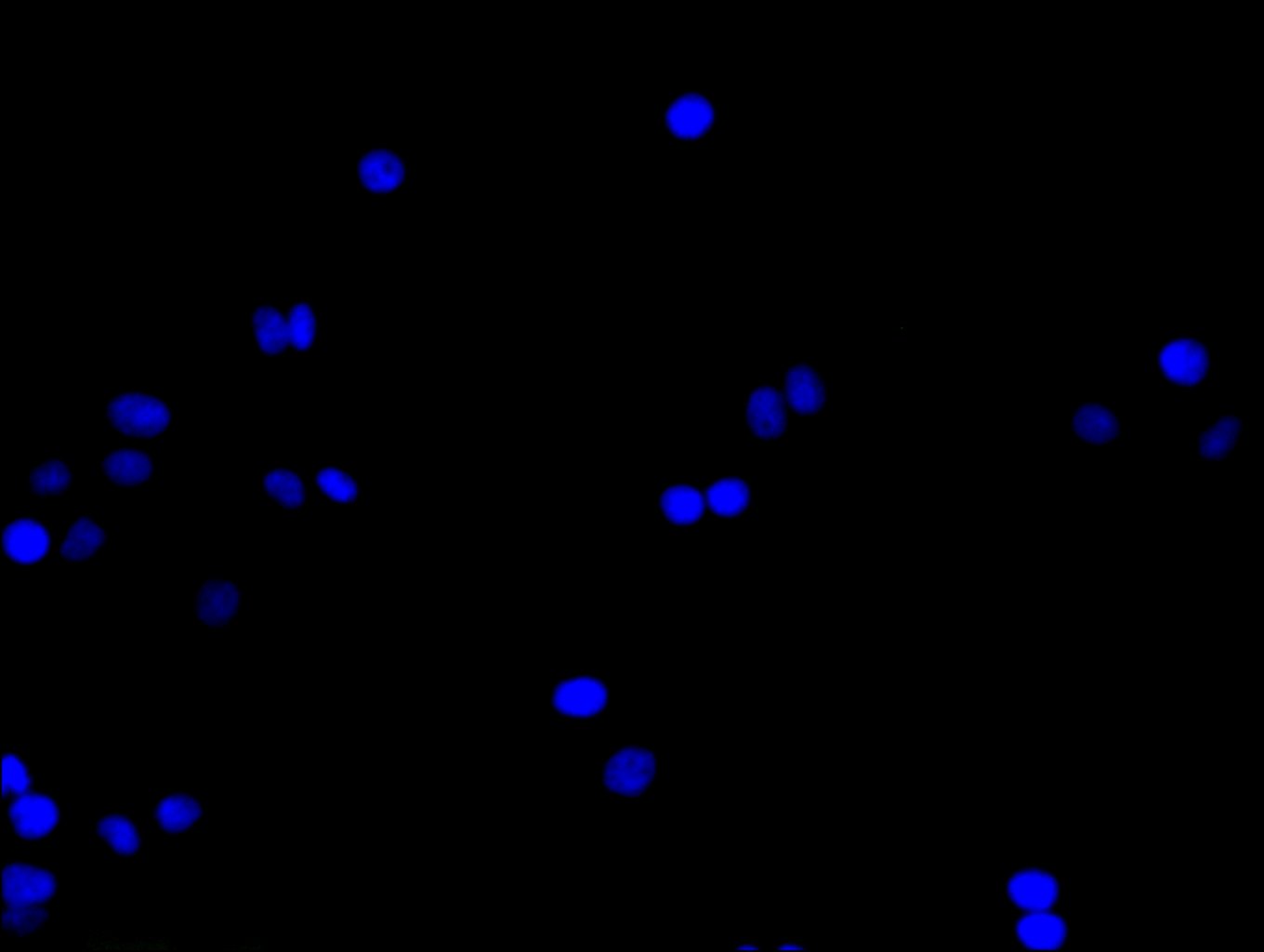 Immunofluorescence staining of Hela cell with 5% goat serum, counter-stained with DAPI. The cells were fixed in 4% formaldehyde and blocked in 10% normal Goat Serum. The cells were then incubated with the antibody overnight at 4C. The secondary antibody was Alexa Fluor 488-congugated AffiniPure Goat Anti-Rabbit IgG(H+L).