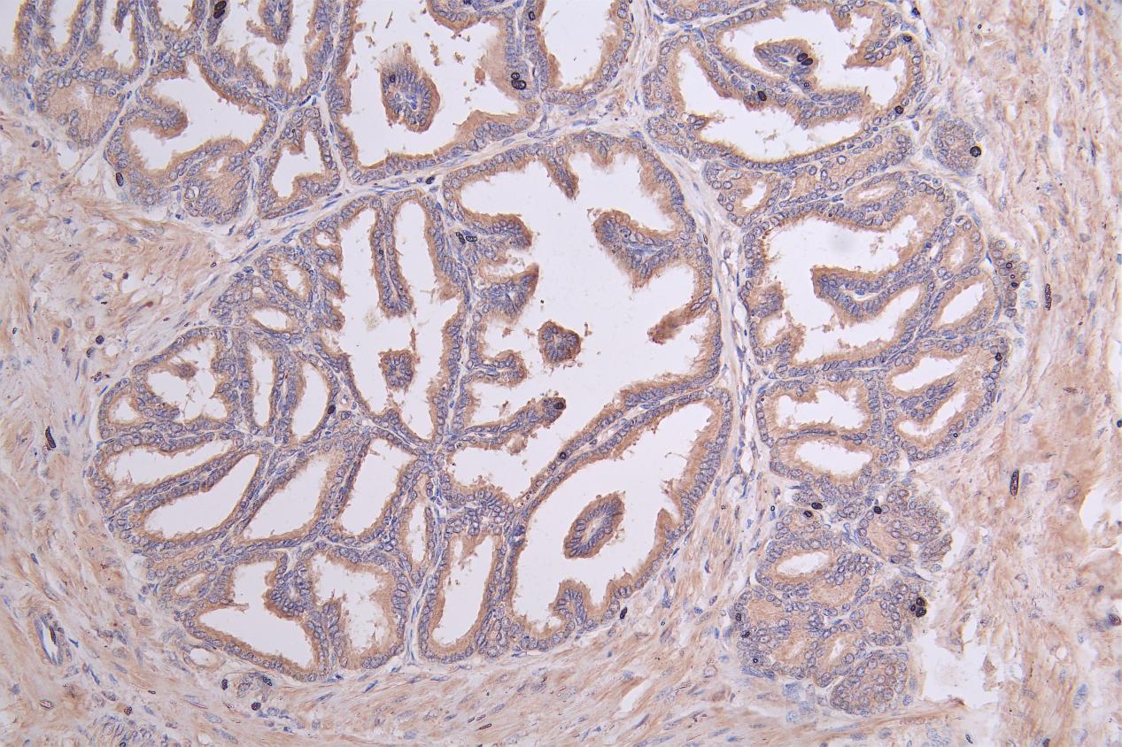 IHC image of CSB-PA020160LA01HU diluted at 1:50 and staining in paraffin-embedded human prostate tissue performed on a Leica BondTM system. After dewaxing and hydration, antigen retrieval was mediated by high pressure in a citrate buffer (pH 6.0). Section was blocked with 10% normal goat serum 30min at RT. Then primary antibody (1% BSA) was incubated at 4°C overnight. The primary is detected by a Goat anti-rabbit polymer IgG labeled by HRP and visualized using 0.05% DAB.
