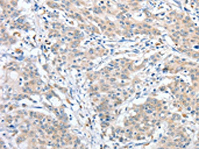 The image on the left is immunohistochemistry of paraffin-embedded Human gastric cancer tissue using CSB-PA579544(RPN1 Antibody) at dilution 1/25, on the right is treated with fusion protein. (Original magnification: ×200)