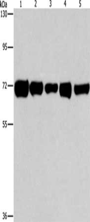 Gel: 8%SDS-PAGE, Lysate: 40 μg, Lane 1-5: Hela cells, A549 cells, MCF7 cells, human liver cancer tissue, Human lung cancer tissue, Primary antibody: CSB-PA579544(RPN1 Antibody) at dilution 1/550, Secondary antibody: Goat anti rabbit IgG at 1/8000 dilution, Exposure time: 1 minute