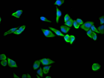 Immunofluorescence staining of Hela cells with CSB-PA020400LA01HU at 1:100, counter-stained with DAPI. The cells were fixed in 4% formaldehyde, permeabilized using 0.2% Triton X-100 and blocked in 10% normal Goat Serum. The cells were then incubated with the antibody overnight at 4°C. The secondary antibody was Alexa Fluor 488-congugated AffiniPure Goat Anti-Rabbit IgG(H+L).