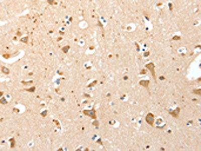 The image on the left is immunohistochemistry of paraffin-embedded Human brain tissue using CSB-PA929601(S100A4 Antibody) at dilution 1/30, on the right is treated with synthetic peptide. (Original magnification: ×200)