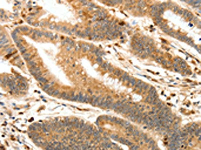 The image on the left is immunohistochemistry of paraffin-embedded Human colon cancer tissue using CSB-PA929601(S100A4 Antibody) at dilution 1/30, on the right is treated with synthetic peptide. (Original magnification: ×200)
