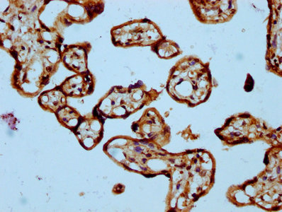 IHC image of CSB-PA020714LA01HU diluted at 1:300 and staining in paraffin-embedded human placenta tissue performed on a Leica BondTM system. After dewaxing and hydration, antigen retrieval was mediated by high pressure in a citrate buffer (pH 6.0). Section was blocked with 10% normal goat serum 30min at RT. Then primary antibody (1% BSA) was incubated at 4°C overnight. The primary is detected by a biotinylated secondary antibody and visualized using an HRP conjugated SP system.