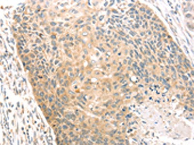 The image on the left is immunohistochemistry of paraffin-embedded Human esophagus cancer tissue using CSB-PA277938(SCAP Antibody) at dilution 1/20, on the right is treated with fusion protein. (Original magnification: ×200)
