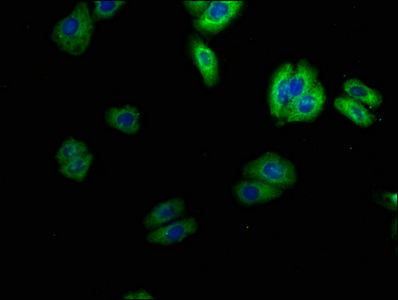 • Immunofluorescence staining of HepG2 cells with CSB-PA818246LA01HU at 1:100, counter-stained with DAPI. The cells were fixed in 4% formaldehyde, permeabilized using 0.2% Triton X-100 and blocked in 10% normal Goat Serum. The cells were then incubated with the antibody overnight at 4°C. The secondary antibody was Alexa Fluor 488-congugated AffiniPure Goat Anti-Rabbit IgG(H+L).