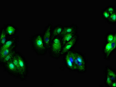 Immunofluorescent analysis of HepG2 cells using CSB-PA327046HA01HU at dilution of 1:100 and Alexa Fluor 488-congugated AffiniPure Goat Anti-Rabbit IgG(H+L)