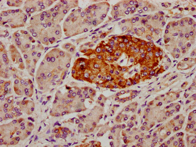 IHC image of CSB-PA885749LA01HU diluted at 1:300 and staining in paraffin-embedded human pancreatic tissue performed on a Leica BondTM system. After dewaxing and hydration, antigen retrieval was mediated by high pressure in a citrate buffer (pH 6.0). Section was blocked with 10% normal goat serum 30min at RT. Then primary antibody (1% BSA) was incubated at 4°C overnight. The primary is detected by a biotinylated secondary antibody and visualized using an HRP conjugated SP system.