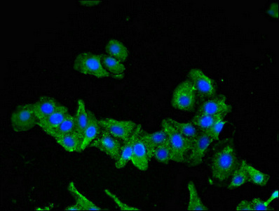 • Immunofluorescent analysis of HepG2 cells using CSB-PA875655YA01HU at dilution of 1:100 and Alexa Fluor 488-congugated AffiniPure Goat Anti-Rabbit IgG(H+L)