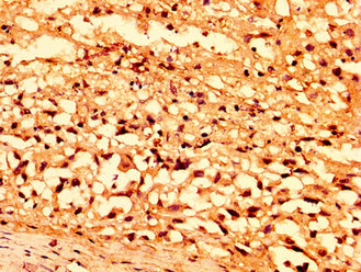IHC image of CSB-PA805340LA01HU diluted at 1:500 and staining in paraffin-embedded human melanoma performed on a Leica BondTM system. After dewaxing and hydration, antigen retrieval was mediated by high pressure in a citrate buffer (pH 6.0). Section was blocked with 10% normal goat serum 30min at RT. Then primary antibody (1% BSA) was incubated at 4°C overnight. The primary is detected by a biotinylated secondary antibody and visualized using an HRP conjugated SP system.