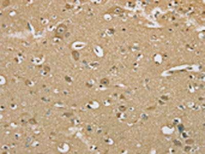 The image on the left is immunohistochemistry of paraffin-embedded Human brain tissue using CSB-PA122539(SERINC1 Antibody) at dilution 1/30, on the right is treated with synthetic peptide. (Original magnification: ×200)