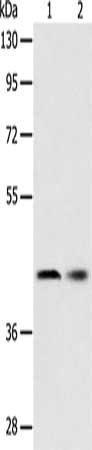 • Gel: 10%SDS-PAGE, Lysate: 40 μg, Lane 1-2: Human fetal liver tissue, Hela cells, Primary antibody: CSB-PA979705(SERPINA5 Antibody) at dilution 1/700, Secondary antibody: Goat anti rabbit IgG at 1/8000 dilution, Exposure time: 10 minutes