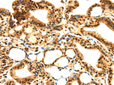 • The image on the left is immunohistochemistry of paraffin-embedded Human thyroid cancer tissue using CSB-PA572039(SERPINB1 Antibody) at dilution 1/30, on the right is treated with fusion protein. (Original magnification: ×200)