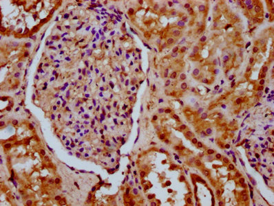 IHC image of CSB-PA855042LA01HU diluted at 1:200 and staining in paraffin-embedded human kidney tissue performed on a Leica BondTM system. After dewaxing and hydration, antigen retrieval was mediated by high pressure in a citrate buffer (pH 6.0). Section was blocked with 10% normal goat serum 30min at RT. Then primary antibody (1% BSA) was incubated at 4°C overnight. The primary is detected by a biotinylated secondary antibody and visualized using an HRP conjugated SP system.