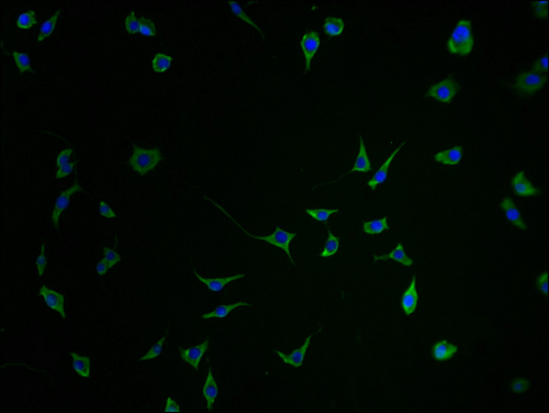 Immunofluorescence staining of SH-SY5Y cells with CSB-PA684467HA01HU-IF at 1:100, counter-stained with DAPI. The cells were fixed in 4% formaldehyde and blocked in 10% normal Goat Serum. The cells were then incubated with the antibody overnight at 4°C. The secondary antibody was Alexa Fluor 488-congugated AffiniPure Goat Anti-Rabbit IgG(H+L).
