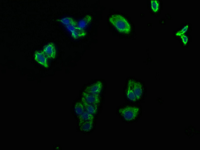 Immunofluorescence staining of HepG2 cells with CSB-PA623000LA01HU at 1:100, counter-stained with DAPI. The cells were fixed in 4% formaldehyde, permeabilized using 0.2% Triton X-100 and blocked in 10% normal Goat Serum. The cells were then incubated with the antibody overnight at 4°C. The secondary antibody was Alexa Fluor 488-congugated AffiniPure Goat Anti-Rabbit IgG(H+L).
