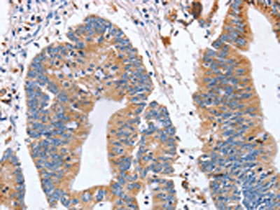 The image on the left is immunohistochemistry of paraffin-embedded Human colon cancer tissue using CSB-PA984002(SIGLEC6 Antibody) at dilution 1/70, on the right is treated with synthetic peptide. (Original magnification: ×200)