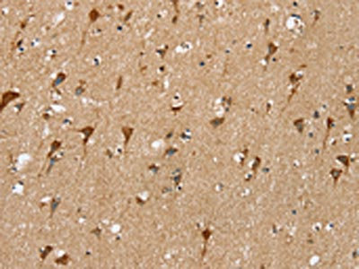 The image on the left is immunohistochemistry of paraffin-embedded Human brain tissue using CSB-PA832162(SIGLEC7 Antibody) at dilution 1/35, on the right is treated with synthetic peptide. (Original magnification: ×200)