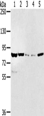 Gel: 6%SDS-PAGE, Lysate: 40 μg, Lane 1-5: HT29 cells, hela cells, mouse liver tissue, A549 cells, Jurkat cells, Primary antibody: CSB-PA211930(SIK1 Antibody) at dilution 1/250, Secondary antibody: Goat anti rabbit IgG at 1/8000 dilution, Exposure time: 10 seconds
