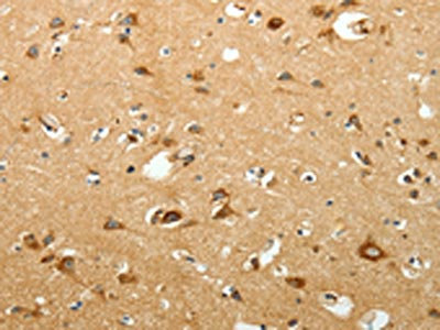 The image on the left is immunohistochemistry of paraffin-embedded Human brain tissue using CSB-PA100396(SIRT3 Antibody) at dilution 1/15, on the right is treated with fusion protein. (Original magnification: ×200)