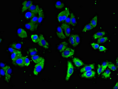 Immunofluorescent analysis of HepG2 cells using CSB-PA614403LA01HU at dilution of 1:100 and Alexa Fluor 488-congugated AffiniPure Goat Anti-Rabbit IgG(H+L)