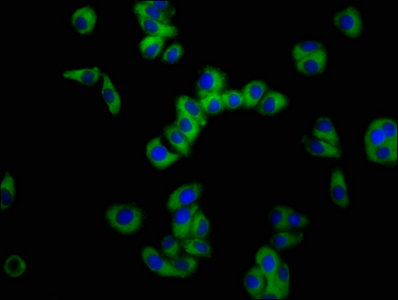 Immunofluorescence staining of HepG2 cells with CSB-PA021381LA01HU at 1:100, counter-stained with DAPI. The cells were fixed in 4% formaldehyde, permeabilized using 0.2% Triton X-100 and blocked in 10% normal Goat Serum. The cells were then incubated with the antibody overnight at 4°C. The secondary antibody was Alexa Fluor 488-congugated AffiniPure Goat Anti-Rabbit IgG(H+L).