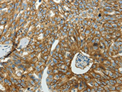 The image on the left is immunohistochemistry of paraffin-embedded Human ovarian cancer tissue using CSB-PA587029(SLC16A1 Antibody) at dilution 1/50, on the right is treated with synthetic peptide. (Original magnification: ×200)