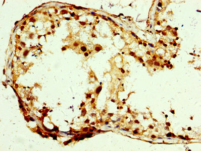 IHC image of CSB-PA743993LA01HU diluted at 1:250 and staining in paraffin-embedded human testis tissue performed on a Leica BondTM system. After dewaxing and hydration, antigen retrieval was mediated by high pressure in a citrate buffer (pH 6.0). Section was blocked with 10% normal goat serum 30min at RT. Then primary antibody (1% BSA) was incubated at 4°C overnight. The primary is detected by a biotinylated secondary antibody and visualized using an HRP conjugated SP system.