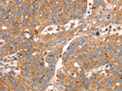 The image on the left is immunohistochemistry of paraffin-embedded Human liver cancer tissue using CSB-PA091535(SLC25A38 Antibody) at dilution 1/25, on the right is treated with synthetic peptide. (Original magnification: ×200)