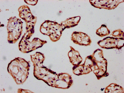 IHC image of CSB-PA021525LA01HU diluted at 1:300 and staining in paraffin-embedded human placenta tissue performed on a Leica BondTM system. After dewaxing and hydration, antigen retrieval was mediated by high pressure in a citrate buffer (pH 6.0). Section was blocked with 10% normal goat serum 30min at RT. Then primary antibody (1% BSA) was incubated at 4°C overnight. The primary is detected by a biotinylated secondary antibody and visualized using an HRP conjugated SP system.