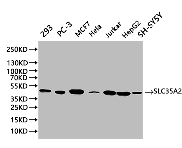 Positive WB detected in: 293 whole cell lysate, PC-3 whole cell lysate, MCF7 whole cell lysate, Hela whole cell lysate, Jurkat whole cell lysate, HepG2 whole cell lysate, SH-SY5Y whole cell lysate All lanes:SLC35A2 Antibody at 1:1000