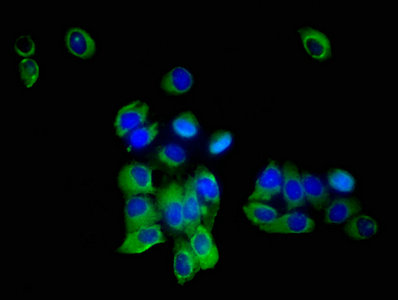 • Immunofluorescent analysis of A549 cells using CSB-PA809010LA01HU at dilution of 1:100 and Alexa Fluor 488-congugated AffiniPure Goat Anti-Rabbit IgG(H+L)
