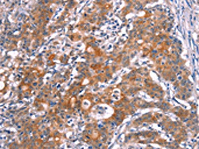 The image on the left is immunohistochemistry of paraffin-embedded Human gastric cancer tissue using CSB-PA778804(SLC6A1 Antibody) at dilution 1/25, on the right is treated with synthetic peptide. (Original magnification: ×200)
