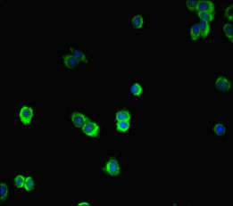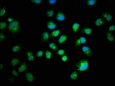 • Immunofluorescent analysis of HepG2 cells using CSB-PA15557A0Rb at dilution of 1:100 and Alexa Fluor 488-congugated AffiniPure Goat Anti-Rabbit IgG(H+L)
