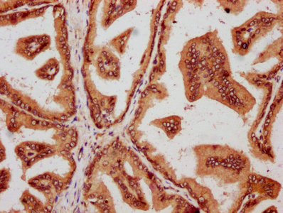 • IHC image of CSB-PA15557A0Rb diluted at 1:600 and staining in paraffin-embedded human prostate tissue performed on a Leica BondTM system. After dewaxing and hydration, antigen retrieval was mediated by high pressure in a citrate buffer (pH 6.0). Section was blocked with 10% normal goat serum 30min at RT. Then primary antibody (1% BSA) was incubated at 4°C overnight. The primary is detected by a biotinylated secondary antibody and visualized using an HRP conjugated SP system.