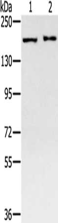 Gel: 6%SDS-PAGE, Lysate: 40 μg, Lane 1-2: 231 cells, K562 cells, Primary antibody: CSB-PA174716(SMC4 Antibody) at dilution 1/400, Secondary antibody: Goat anti rabbit IgG at 1/8000 dilution, Exposure time: 4 minutes