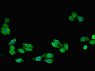 Immunofluorescent analysis of HepG2 cells using CSB-PA885725YA01HU at dilution of 1:100 and Alexa Fluor 488-congugated AffiniPure Goat Anti-Rabbit IgG(H+L)