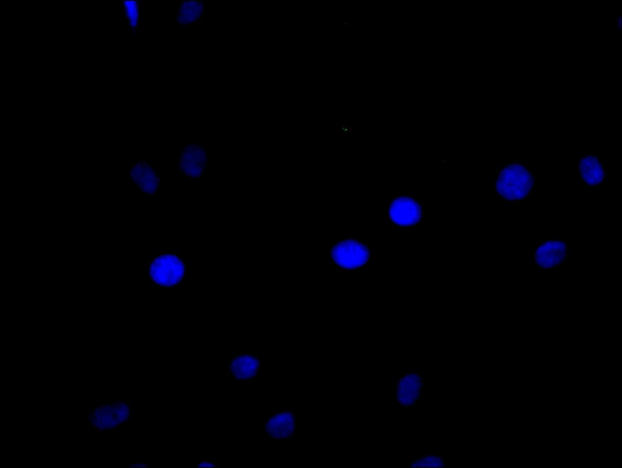 Immunofluorescence staining of A549 cell with CSB-PA857876LA01HU at 1:130, counter-stained with DAPI. The cells were fixed in 4% formaldehyde and blocked in 10% normal Goat Serum. The cells were then incubated with the antibody overnight at 4C. The secondary antibody was Alexa Fluor 488-congugated AffiniPure Goat Anti-Rabbit IgG(H+L).
