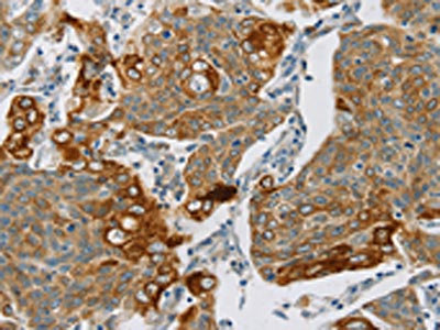 • The image on the left is immunohistochemistry of paraffin-embedded Human cervical cancer tissue using CSB-PA169309(SMOC2 Antibody) at dilution 1/30, on the right is treated with synthetic peptide. (Original magnification: ×200)