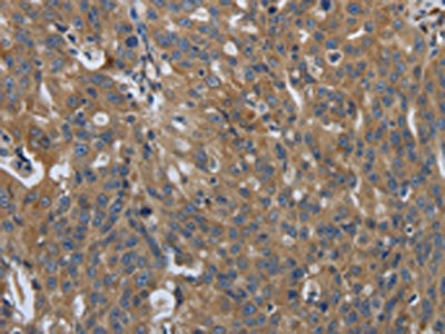 The image on the left is immunohistochemistry of paraffin-embedded Human liver cancer tissue using CSB-PA277236(SOCS1 Antibody) at dilution 1/90, on the right is treated with synthetic peptide. (Original magnification: ×200)