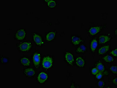 Immunofluorescent analysis of A549 cells using CSB-PA022395ESR1HU at dilution of 1:100 and Alexa Fluor 488-congugated AffiniPure Goat Anti-Rabbit IgG(H+L)
