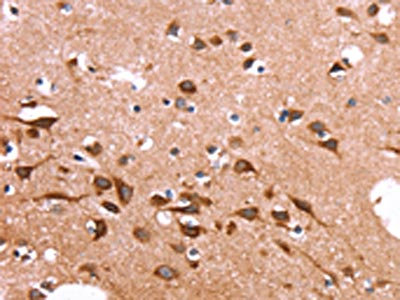 The image on the left is immunohistochemistry of paraffin-embedded Human brain tissue using CSB-PA162393(SPAST Antibody) at dilution 1/20, on the right is treated with synthetic peptide. (Original magnification: ×200)