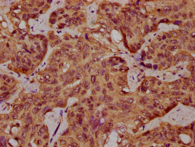 IHC image of CSB-PA707717LA01HU diluted at 1:400 and staining in paraffin-embedded human liver cancer performed on a Leica BondTM system. After dewaxing and hydration, antigen retrieval was mediated by high pressure in a citrate buffer (pH 6.0). Section was blocked with 10% normal goat serum 30min at RT. Then primary antibody (1% BSA) was incubated at 4°C overnight. The primary is detected by a biotinylated secondary antibody and visualized using an HRP conjugated SP system.